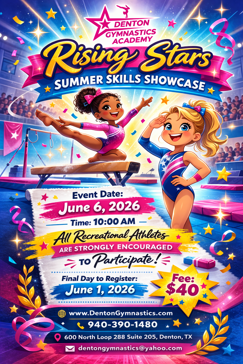 Join us at the Rising Stars Summer Skills Showcase where confidence meets skill and every athlete gets their moment to shine. From first cartwheels to fearless beam routines, this is your time to show what youโve been working for.